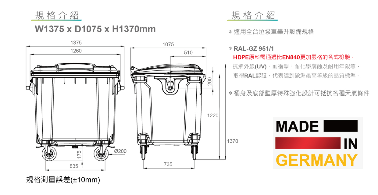 四輪大型垃圾子車 EN840國際認證 RAL-GZ 951/1德國權威認證