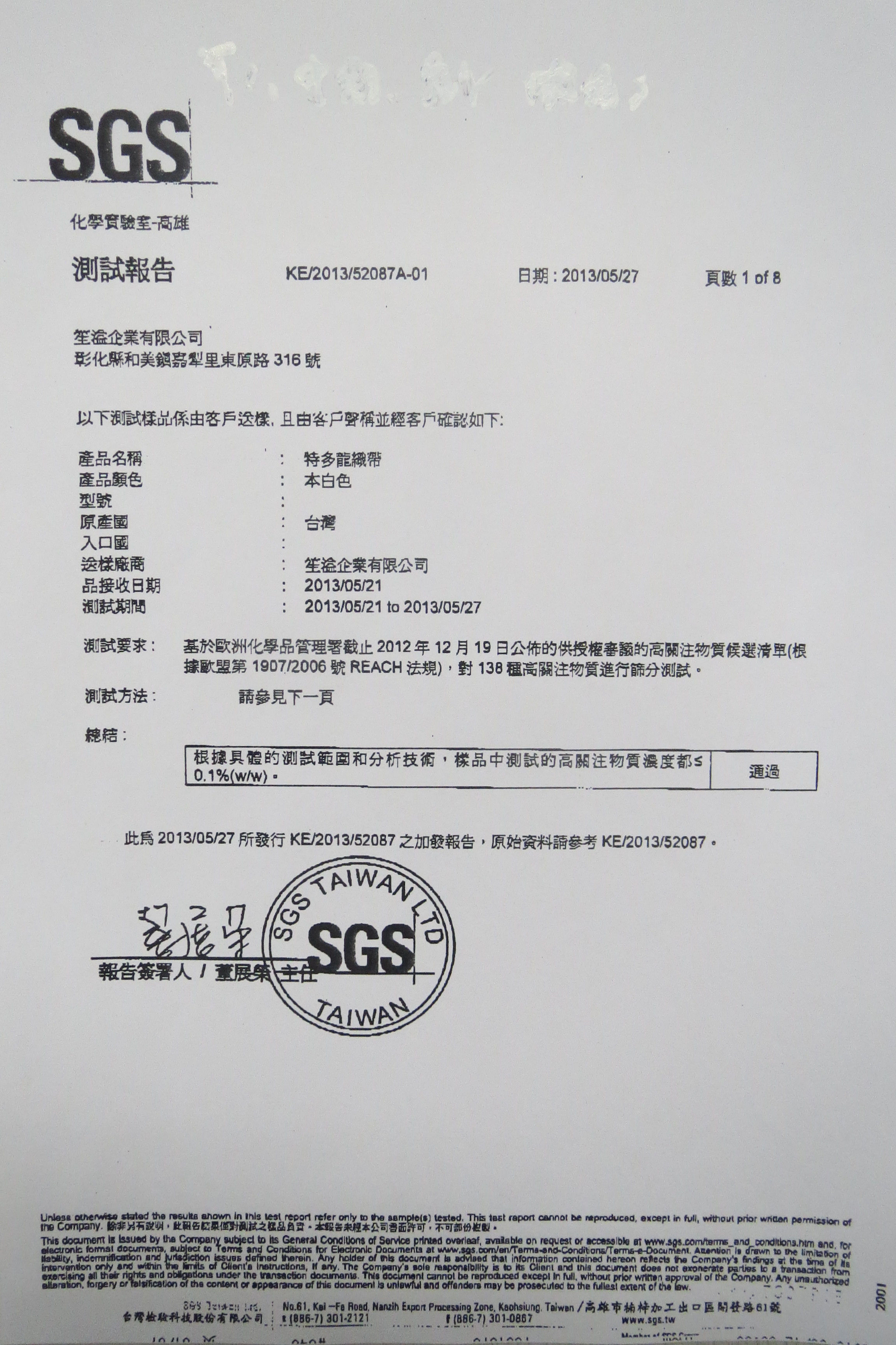 本公司伸縮帶欄柱系列之織帶,經SGS國際認證機構嚴格檢測,獲致織帶(特多龍材質)無毒測試認證,因織帶為使用者最常觸碰的部分,為保狀消費者權益,並確保產品品質,特別透過國際認證機構進行測驗。